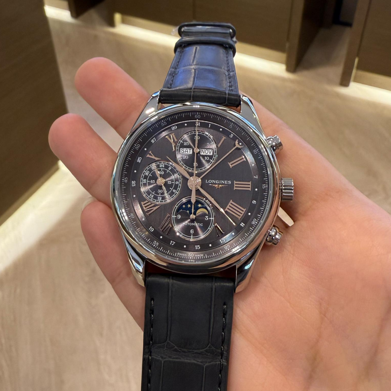 Chronograph mechanism: central 60 seconds hand, moon phase display with 12 hours counter at 6 o’clock and 30 minutes counter with day and month display at 12 o’clock