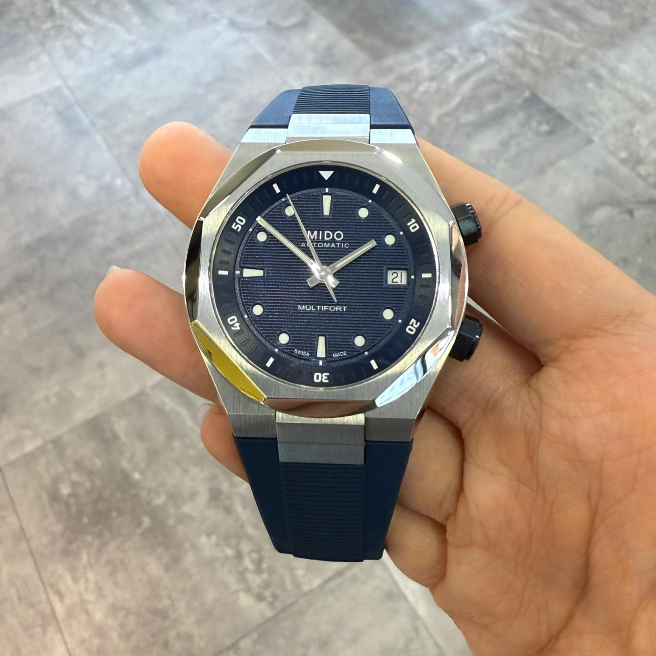 The audacity of the Multifort 8 Two Crowns changes the game! This visionary model with its octagonal bezel, is emphasised by a horizontal relief stamped dial while white Super-LumiNova® enhances the visibility of the indexes. This powerful timepiece reinvents the codes, creating a new dimension: the TECHNOMETRY, the perfect blend of TECHNOLOGY and GEOMETRY. It is equipped with an internal rotating flange, activated by a second crown located at 2 o’clock while the hours and date can be set through the 4 o’clock crown. This model houses the Calibre 72 with Nivachron™ technology, a movement specifically chosen for its slimness and exemplary reliability to meet the challenges of everyday life, now and into the future.